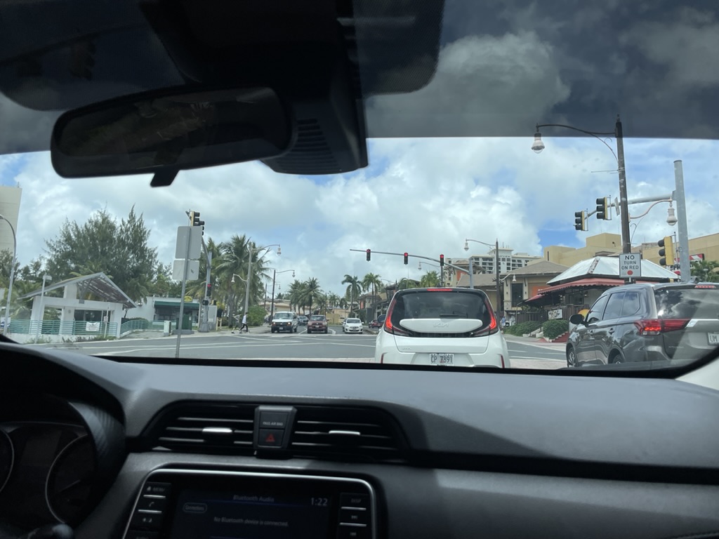 午前中のフライトでグアムへ。空港からはレンタカーで移動しました。グアムの道路は左ハンドル・右側通行ですが、道路はシンプルで交通量も多くないため、レンタカー初心者でも比較的運転しやすいです。