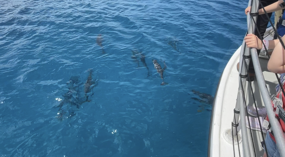イルカは船のすぐ横を群れで泳いでくれて、子どもも大興奮でした。ずっと船の後ろをついてきたり飛び跳ねてくれたり。