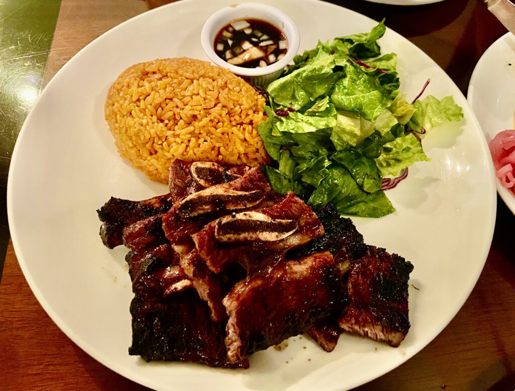 Proaで外せないのがこのBBQです。炭火で焼き上げたショートリブは表面が香ばしく、中はしっかりジューシー。隣に添えられたオレンジ色のレッドライスは、チャモロ料理ならではのアチョーテという植物で色付けされたご飯で、ほんのり風味があります。