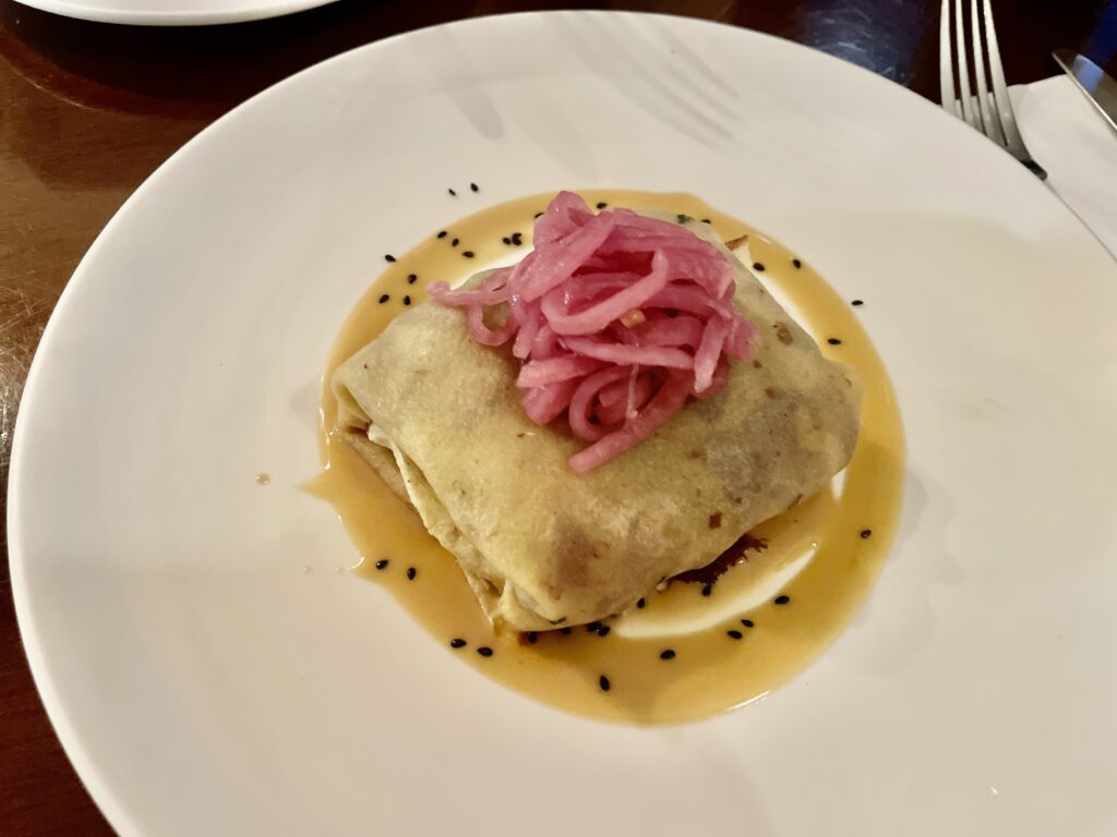 チャモロ料理らしいフィリングをクレープ生地で包んだ一品は、ソースとピクルスオニオンの組み合わせが絶妙で、見た目も上品でした。チャモロ×フレンチの融合がよくわかるProaらしい一皿です。